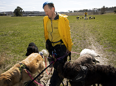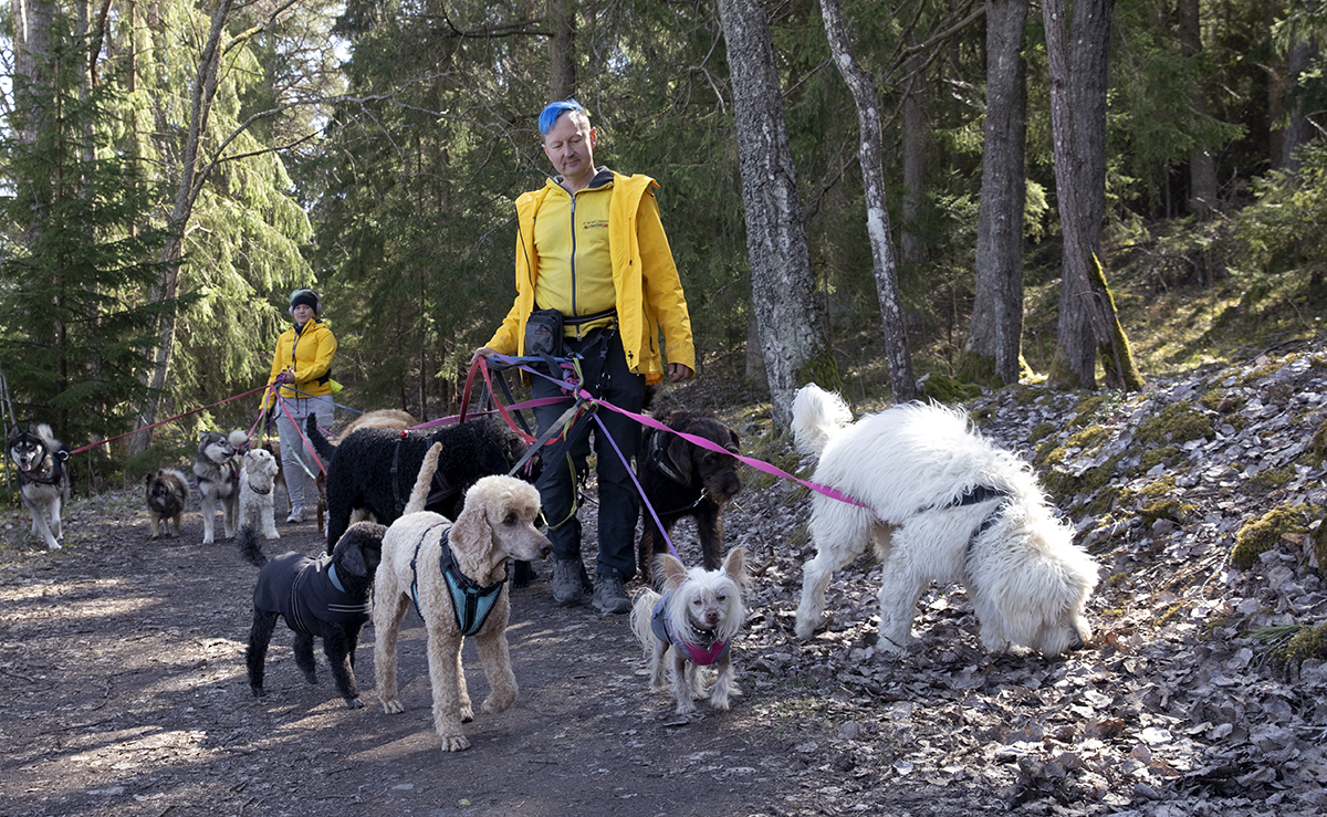 Janne och Julia har hunnit luncha medan hundarna dåsat i bussen. Båda är naturmänniskor och njuter som andra flanörer denna dag av vårljus och vitsippor. Nu samlar de varsin hundskock igen för dagens sista promenad. De följer en stig in bland granarna, likt centrum i varsin karusell av koppel som ständigt trasslar ihop sig.
