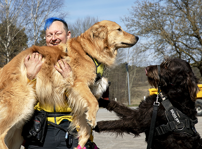 Annan träning handlar om möten med människor, djur och cyklister. Godiset som fyller hundförarnas fickor kommer väl till pass. Govännen med allergi får sitt eget.