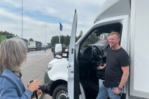 Intill Sebastians bil sitter chauffören Ljubbe, som inte vill vara med på bild. Han kör varor för Jysk åt ett åkeri i Jönköping och är på väg tillbaka efter att ha lossat i Stockholm.