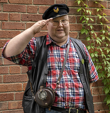 Museiväktaren Bror Hellman ståtar med en av Transports ombudsmannakepsar från sina samlingar. Lägg märke till vingarna och hjulet i loggan! Bara korset finns numera kvar. Ronduret i läder var ett slags stämpelklocka som vakterna bar över axeln för att ”pricka av” sin rond. Foto: Justina Öster