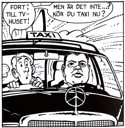 Äldre chaufförer minns Transports legendariska ordförande Hans Ericson väl. 1980 tvingades han avgå efter en solresa till Kanarieöarna under LO:s bojkott av det Francostyrda Spanien. Här har taxiföraren Ratte bytt plats med Ericson. Text Magnus Knutsson och bild Ulf Jansson.