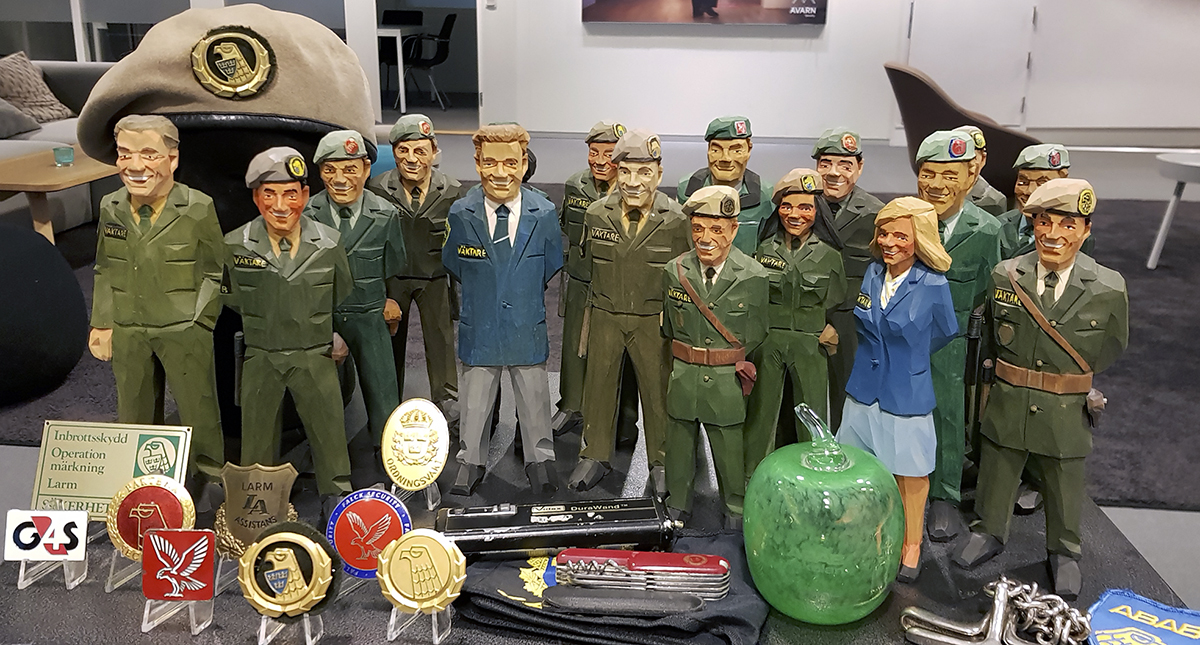 Brors fråga blir hängande över vitrinskåpet i hans pappersbelamrade arbetsrum. Där står hans och kollegornas samling av uniformsbaskrar, kepsar, märken, rondur (se faktaruta), täljda väktargubbar och gummor… Alla sorters bevakningsprylar som brukar locka till sig bolagets besökare.