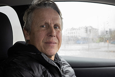 – För ovanlighetens skull regnar det här, säger han och rattar in på en gata med gångtrafik. Elbilen smyger fram.