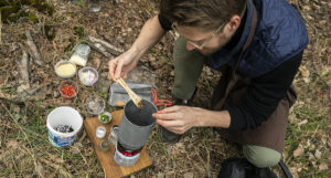 Ola Albrektsson packar upp gasolköket, inhandlat långt innan det blev årets julklapp, och medhavd stekpanna. Bäst att laga coronasäkert, i det fria. Det passar honom, som tillbringat mycket tid i skog och mark med sin pappa. Han radar upp hackad tomat, rödlök och skivad purjolök mellan myrstackarna. Plockar sedan rädisor, riven ost och chilimajonnäs ur väskan.