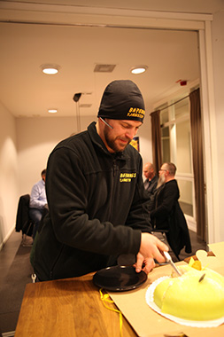 Några av bärgarna som kommer in i lunchrummet undrar varför är facket är här med tårta. En av dem förklarar att han självklart är med i facket ”för att morsan lärde mig det”.