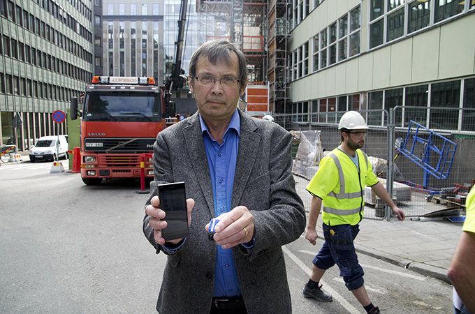 På stora bilden här nedanför poserar den nu pensionerade forskaren Lage Burström med mobil och mätare, som kan skicka varnande vibrationsvärden till en mobilapp. Men projektet kom av sig.