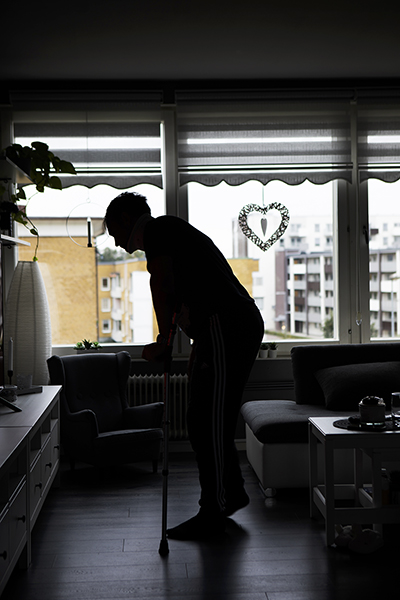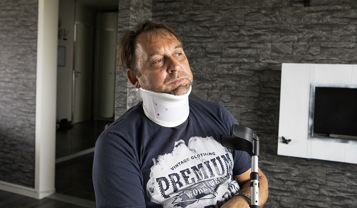 Han har en plastkrage för att fixera nacken. I varje rörelse grimaserar han och rör sig försiktigt för att inte smärtan ska ta över. Dottern sitter i rummet bredvid. Det tar honom tio minuter att ge henne ett glas vatten när hon ropat på honom.