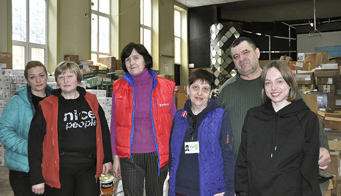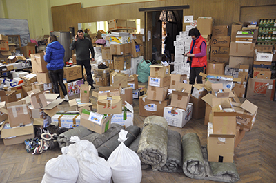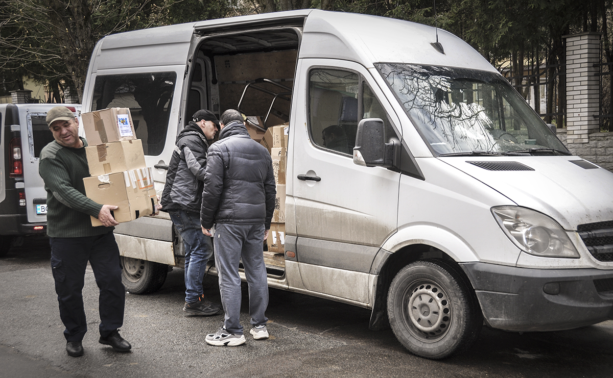 När jag besöker ett sådant hjälpcenter i Lviv, inhyst i en stor konsertsal tillhörande Lvivs Tekniska Högskola, pågår ett frenetiskt arbete där. En minivan med humanitär hjälp från Frankrike har just anlänt. Alla kartonger ska bäras in, alla varor ska kollas och sorteras. Snart kommer en till – med nödhjälp från Polen.