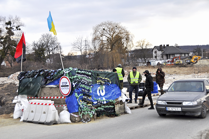 Längs vägen mot den polska gränsen är det vägposteringar var femte till tionde kilometer, med betongblock, sandsäckar och stridsvagnshinder. Många är bemannade av beväpnade soldater från Ukrainas försvar som ibland kontrollerar de resandes id-handlingar.