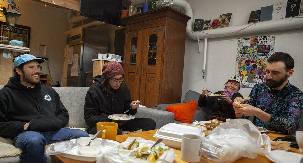 De andra medlemmarna halkar in en efter en. Någon kokar tevatten i kaffebryggaren. Kristina Arnaudova är tillbaka, nu med mat, det är bröd, ris, röror, någon slags gryta.