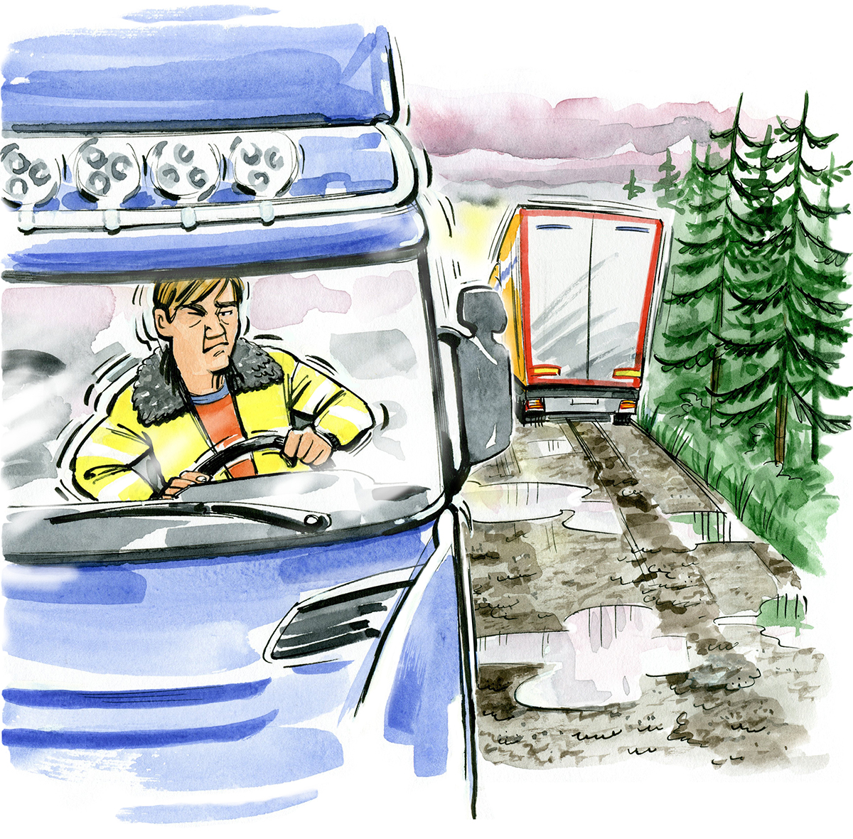 Flisbilsföraren Johan (fingerat namn) skakade sönder rygg och nacke i en dålig förarstolstol på knaggliga norrländska vägar. I dag är han sjukskriven med ständig värk. Han längtar tillbaka ut på vägen och får juridisk hjälp av Transport och fackets juridiska byrå LO-TCO Rättsskydd för att få ut ersättning från Försäkringskassan. Illustration Michael Schneider