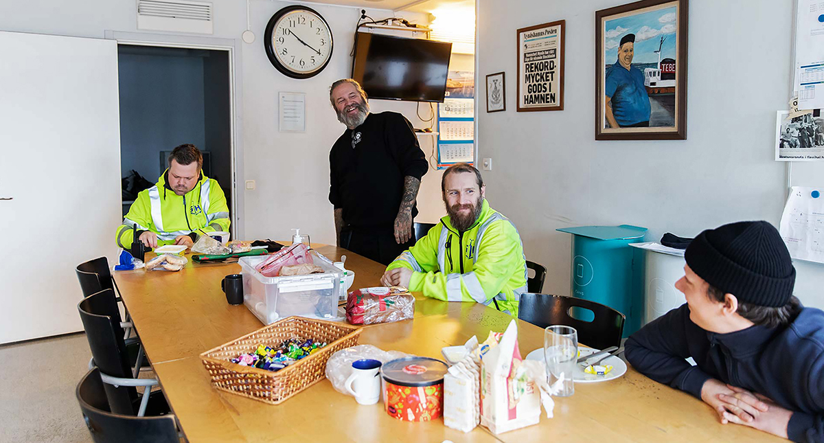Vi går uppför trappan till fikarummet. På väggarna hänger gamla kartor och svartvita fotografier på stuveriarbetare. Det går att vila på en luggsliten soffa framför en tv och i rummet bredvid sitter några hamnarbetare och käkar sista mackan efter lunch vid ett avlångt bort.
