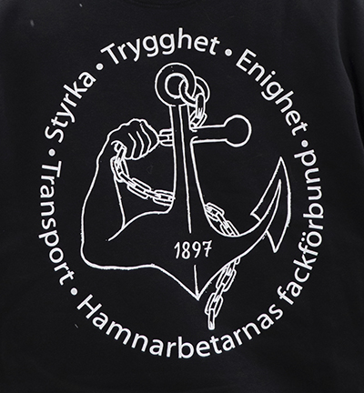 Transports hamnarbetare har en luvtröja som delas ut vid kurser. Stefan fixade pengar så att han kunde ge tröjor till jobbarkompisarna i Nynäshamn.