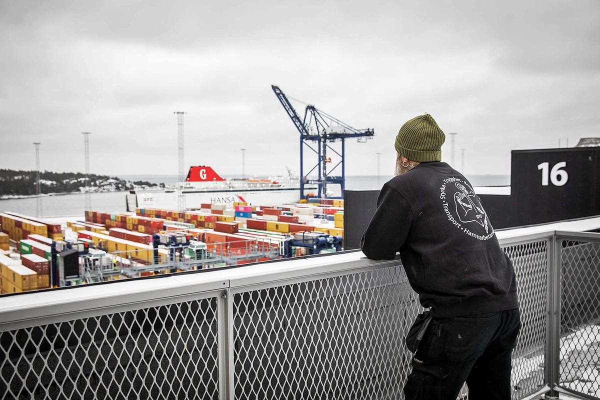 Hamn. En råkall dag vid färjehamnen i Nynäshamn. Transportarbetaren möter Stefan Gidlöf. Fulltatuerad hamnarbetare som vill att facket tänker nytt.