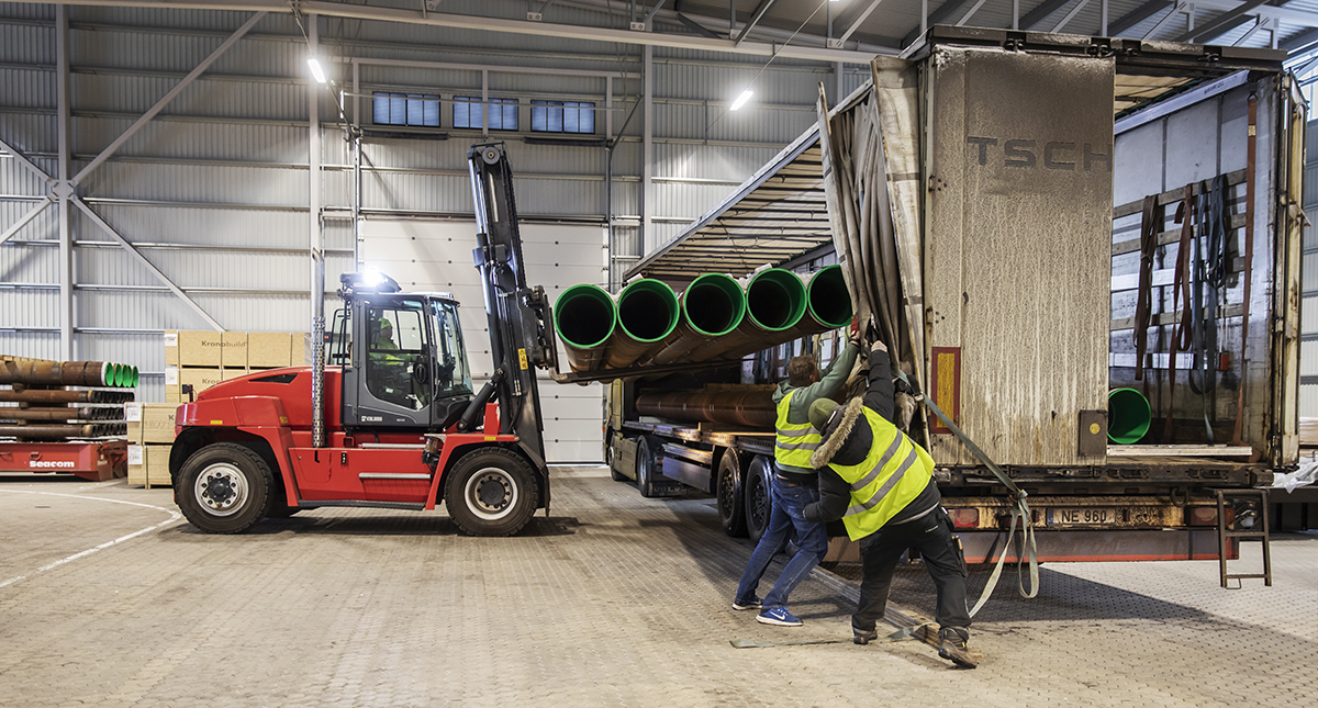 Vi kör till omlastningslagret i hus nummer 24. En röd Kalmar-truck lastar om stålrör.
