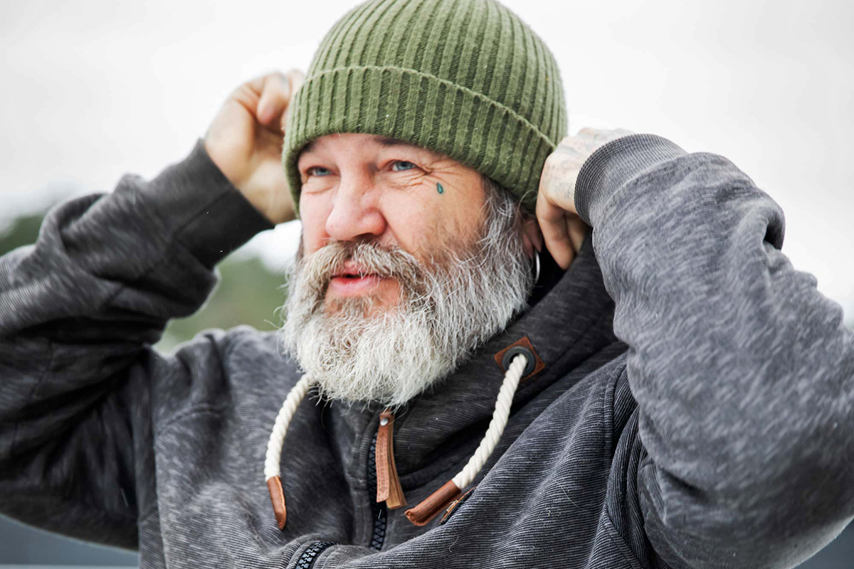 – Grabbarna har slitit ut dem så att det knappt finns något tryck kvar på dem. De drar upp luvan när det blåser småspik.