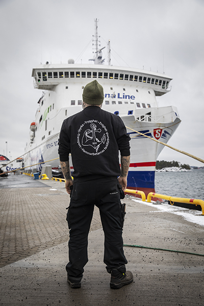 Stefan och hans jobbarkompisar förtöjer och lägger av förtöjningar varje dag. Vi står nere på kajen och han pekar på de tunga trossarna som håller ett Stena Line-fartyg i kajläge samtidigt som Östersjövinden biter sig igenom klädernas lager.