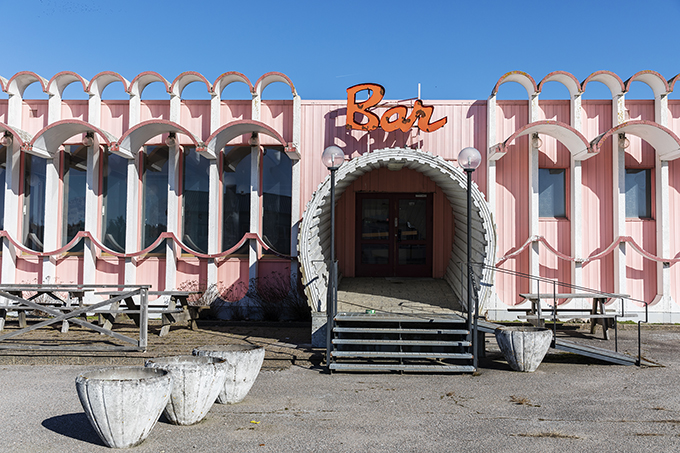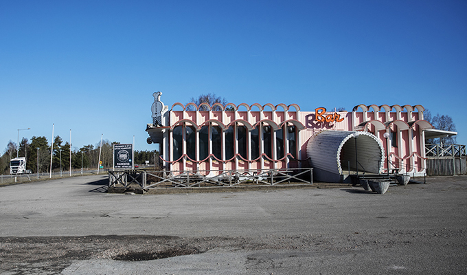 Vi fortsätter vidare mot Götene. Men det går inte att skriva om den här sträckan utan att stanna till 2 mil norr om samhället, i Brännebrona. Det rosa motellet med sina böljande betongformer ser nämligen inte ut som något annat.