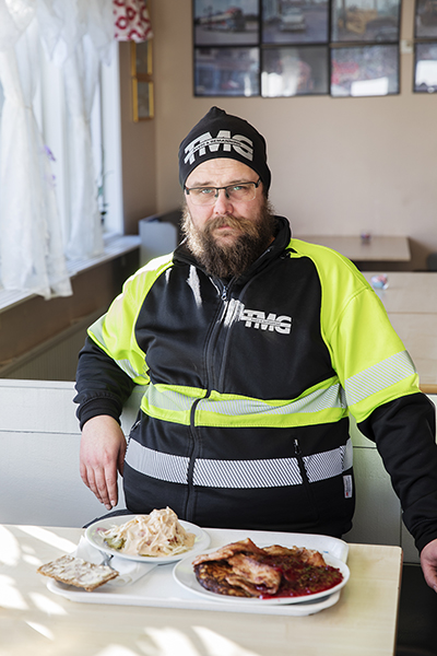 Den stora parkeringen lockar framför allt till sig lastbilschaufförer. En av dem är Fredrik Malm som kör varor till Coop-butiker. Han tar en dagens, raggmunk med stekt fläsk för 90 kronor.
