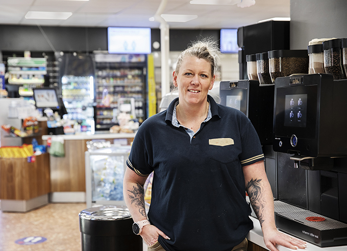 Inne på macken står Frida Wilsson och plockar i ordning vid kaffemaskinen. Hon bor i Mariestad och har arbetat här i 32 år.