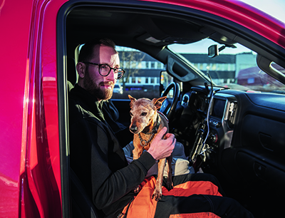 Något rör sig i bilen mellan henne och Andreas. Det är Andreas hund, dvärgpinchern Melker, som bökar runt i sin bädd. Melker är alltid med Andreas på jobbet.