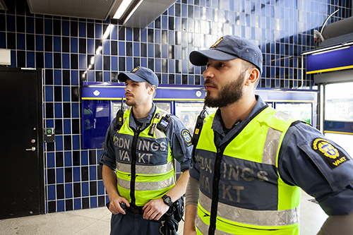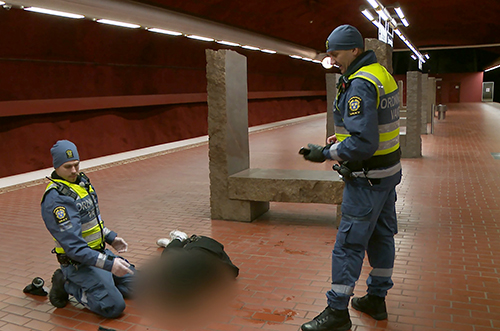Den glider in på centrumgången och stannar utanför t-banans entré. De båda ordningsvakterna går en runda på perrongen. Mycket riktigt är mannen borta. På väg ut hälsar de på en äldre herre som sitter på en bänk vid rulltrappan.