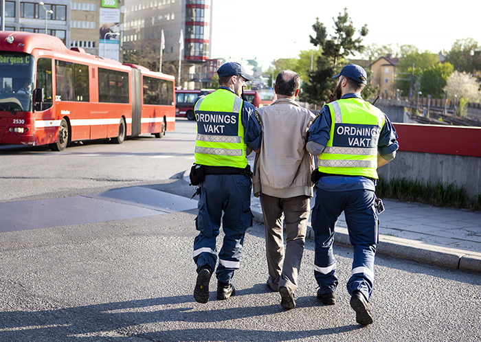 De båda ordningsvakterna följer med till bänken där mannen sitter och väntar på bussen. Ares ber honom lämna platsen. Han sitter kvar med argumentet att han är lugn.