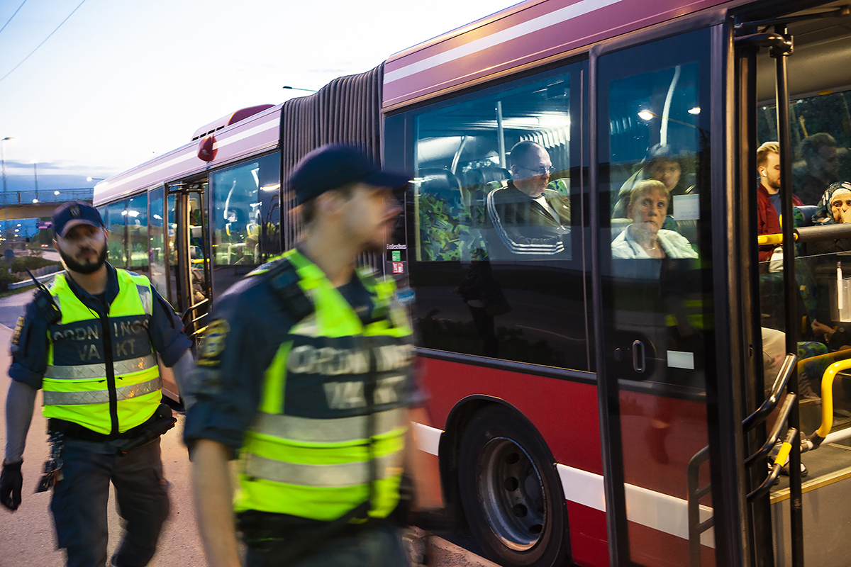Vid åttatiden kör de ut till Tyresö centrum. De ska bevaka bussterminalen under någon timme. Inget särskilt har hänt, men just den regelbundna närvaron av ordningsvakter är trygghetsskapande.