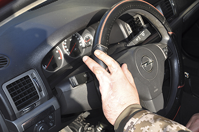 Petro Burjak kommer körande i en vanlig automatbil. Han visar hur han hanterar gaspedalen med högra benet, eller rättare sagt med protesen som går upp till halva låret och även innefattar ett konstgjort knä.