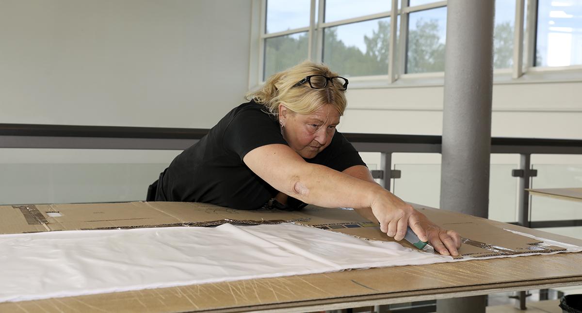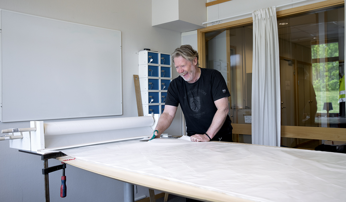Leif Gustafsson lutar sig fram över tillskärningsbordet som nu tronar i ett av kontorsrummen. Plasten drar han ut över bordet från en bred rulle och klipper ett snitt rakt av över en markerad linje. På bordet ligger redan en bunt.