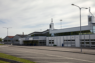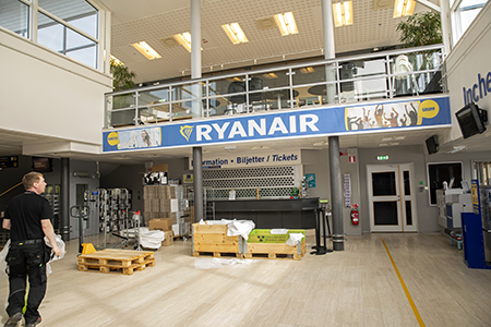 Han ser på högen som växer under kollegans sax. Snart är det dags att rulla de hopbuntade plastsjoken på vagn till övervåningen. Där breder incheckningshallen ut sig i flödande sol genom väggar av fönsterglas. Utanför tävlar sommargrönskan med gyllengula rapsfält och på håll tränar ett av planen från de fyra flygskolorna. De tar inte paus.