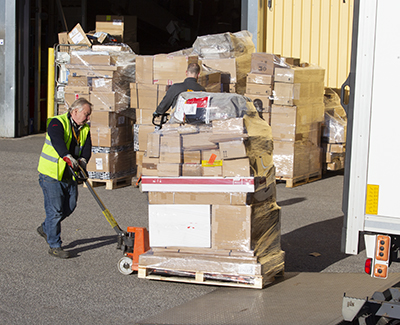 Vid porten – utomhus, direkt på asfalten – pågår ett intensivt lastningsarbete. Distributionsförare från åkeriet Best lastar på pall efter pall. En del är över två meter höga. Manuell pallyftare är enda hjälpmedlet.