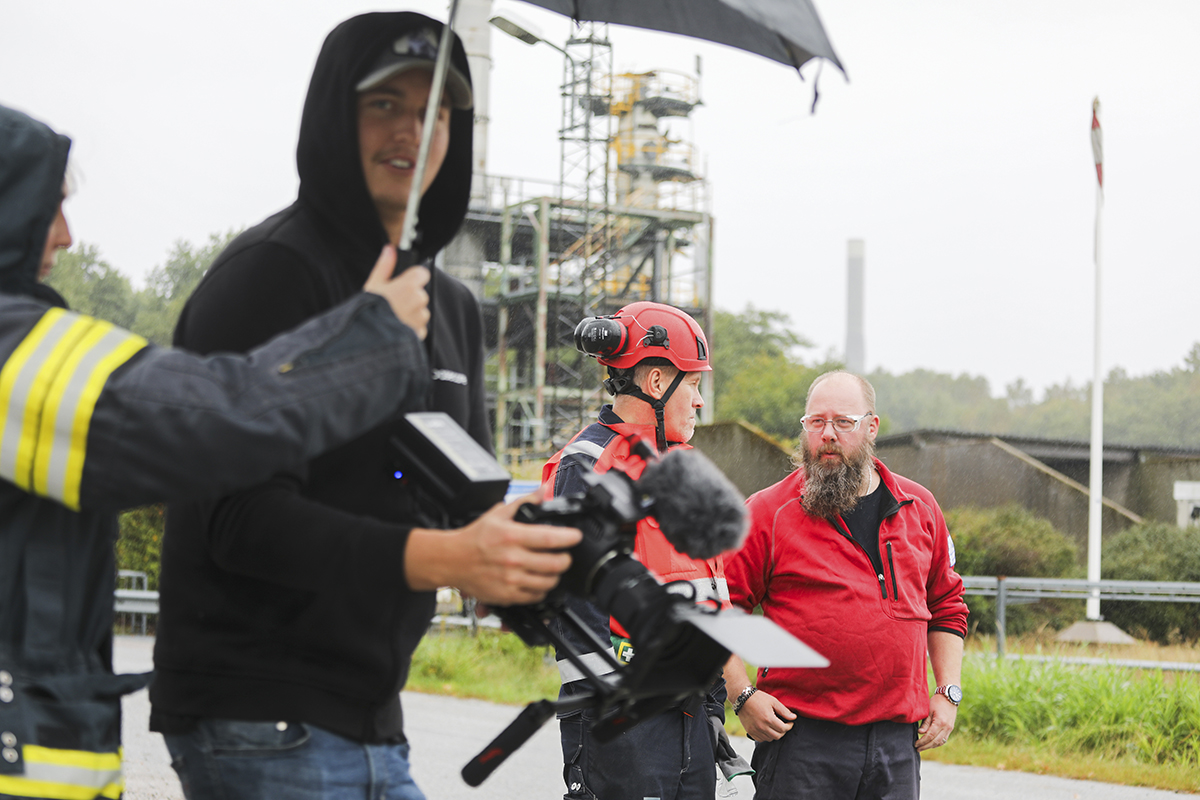 Den första inspelningsdagen för filmen, som produceras till företagets hemsida, var i somras. Då eldade de på ordentligt och visade hur släckningsarbetet går till. Men den här mulna dagen i september handlar det om en vanlig arbetsdag. Från att vakten går upp på morgonen, till dess att han eller hon kommer hem på kvällen.