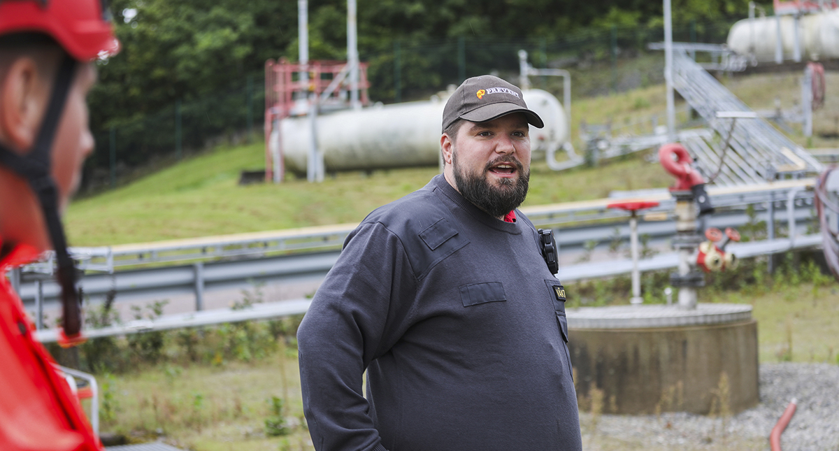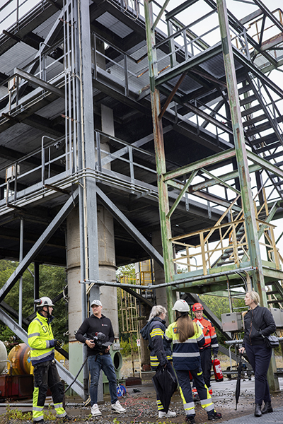Mikael Hen är också en av tre säkerhetsvakter på företaget som har utbildat sig i räddning i slutna utrymmen. Under utbildningen har han lärt sig att använda särskild räddningsutrustning.