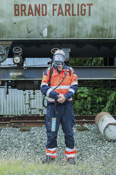 Ny scen. Mikael Hen hakar loss en orange dosa från skyddsjackan och drar ut en antennlikande grej. Apparaten är en gasmätare. Det har slutat regna så Greta Helleblad slipper hålla i paraplyet. Hon jobbar också som instruktör på Bränningen och förklarar:
