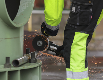 Andreas Henriksson drar fram en vinkelslip och börjar kapa ett rör. Kameramannen ropar ”tryck hårdare” så att gnistorna ska bli större.