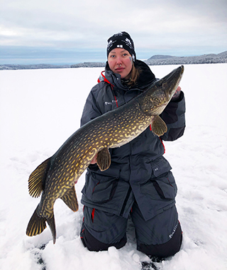 För Martinas del är gäddan favoritfisk. Att gå i närkamp, för gäddor är starka, dra den över ytan och se den från båten, landa den i håven.
