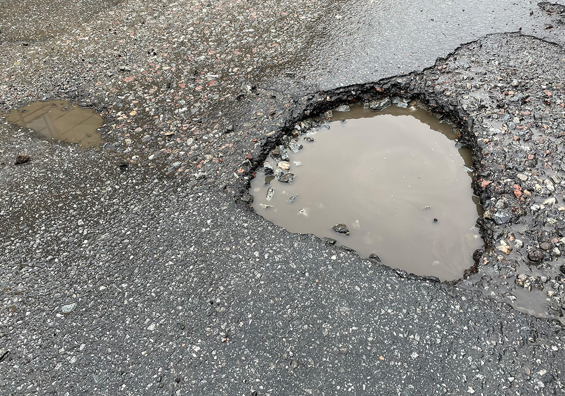 Den här vintern har ovanligt många vägar fått skador på grund av kraftigt växlande väderlek. När det gått från plusgrader och regn till minusgrader har vatten som trängt ned i håligheter frusit, vilket lett till att is sprängt ut större ytor.