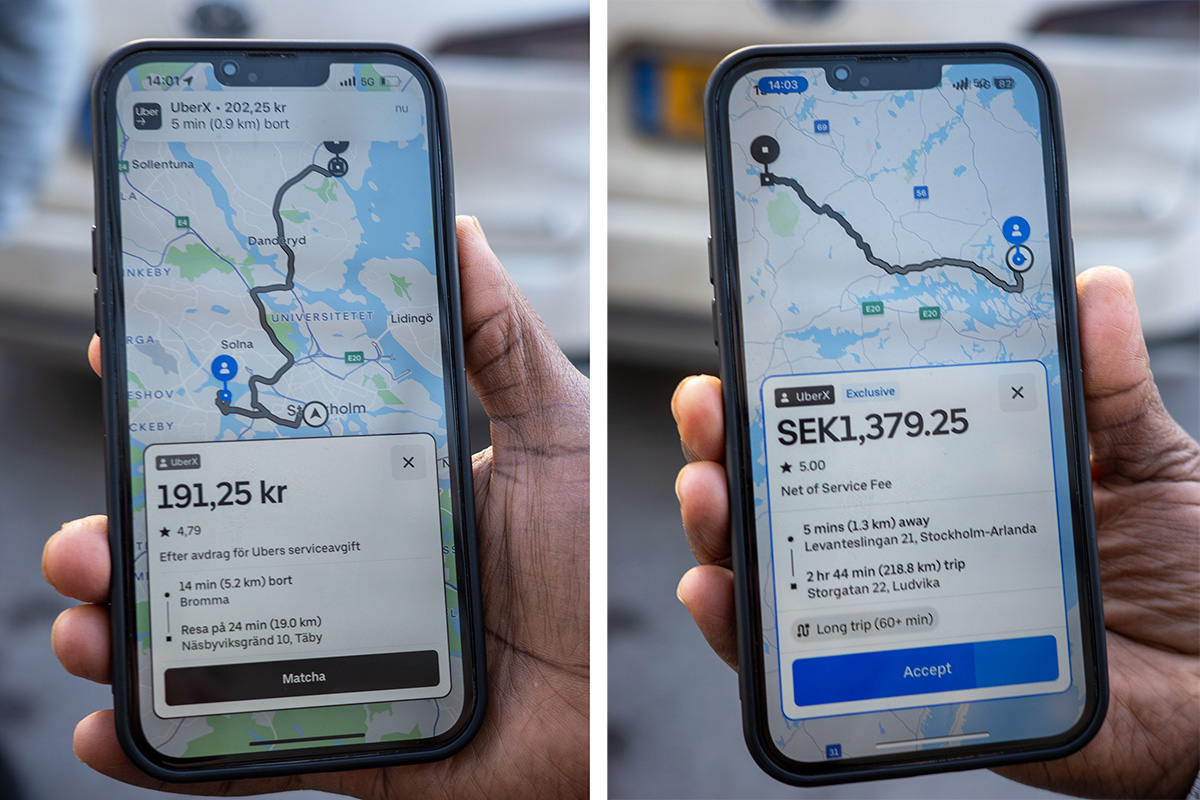 Men de senaste dagarna har ingen av dem haft mer än enstaka körningar. Alla tre har registrerat sig hos Bolt och Uber. Och provat, och liknar det vid slaveri. Appföretagens tal om möjlighet som chaufför att välja kunder avfärdar de. I realiteten var det nödvändigt att köra oavbrutet, säga ja till alla körningar.