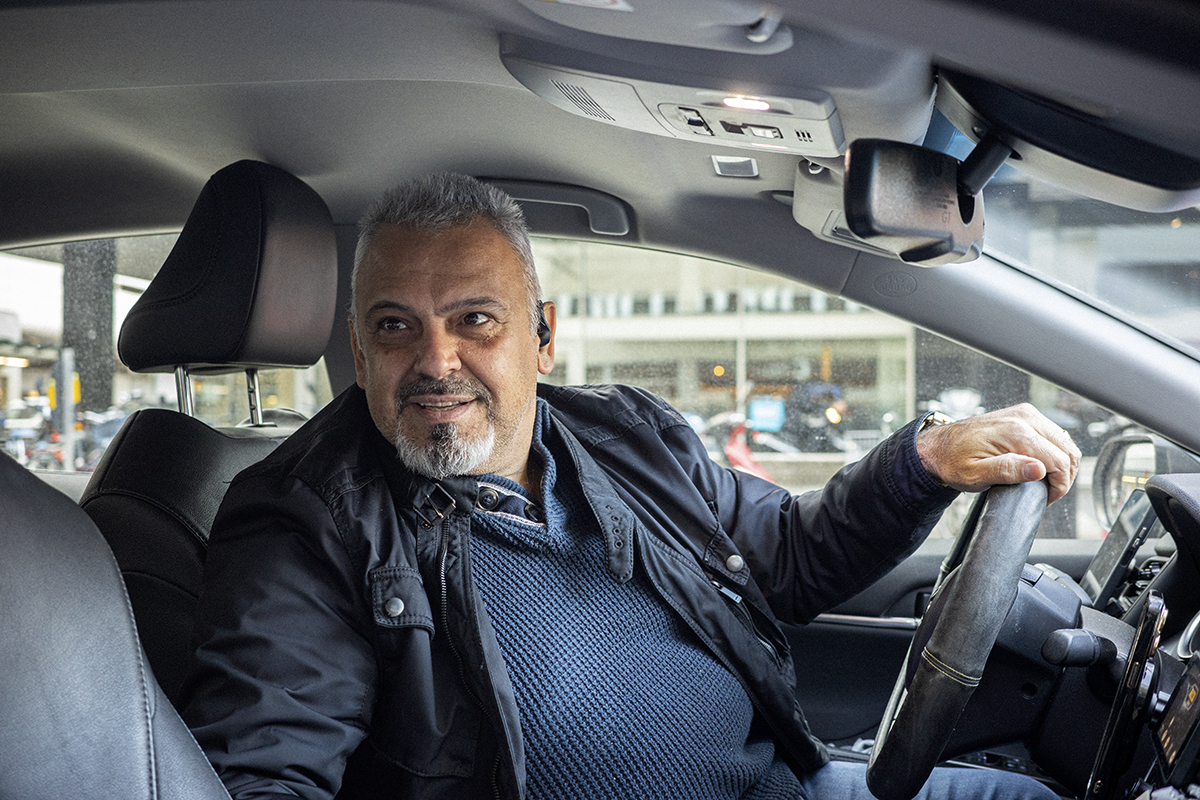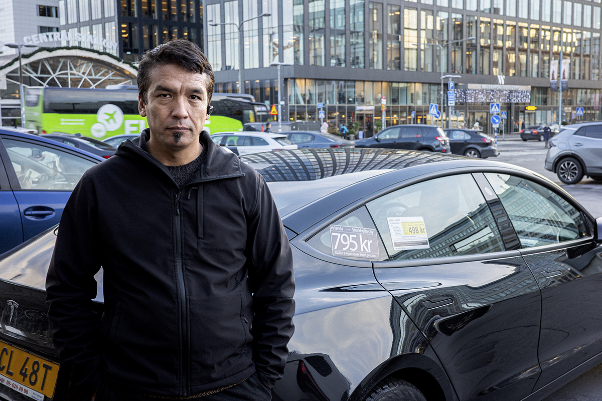 En svart Tesla parkerar vid de andra svarta taxibilarna utanför Centralen. Enmansåkaren Shir Rezai körde tidigare för Taxi 020 (Cabonline) och var nöjd, sedan kom pandemin och allt gick ned. Då provade han att köra för både Bolt och Uber. Nu är han sin egen och kombinerar att plocka kunder på gatan med att ta några körningar från apparna.