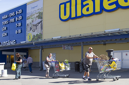 Stefan Gustafsson går ut på en ronderingsvända bland glassätare och fullastade kundvagnar. Inte så få besökare drar två vagnar per näsa.
