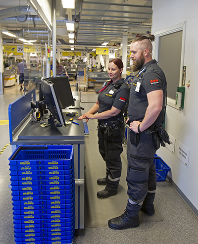Som skyddsombud har Stefan Gustafsson haft en del att jobba med. En ny, mer ergonomisk kunddisk och ett fallskydd vid flaggstängerna på taket är två exempel. Det ingår i väktarnas uppgifter att hissa och hala flaggorna.