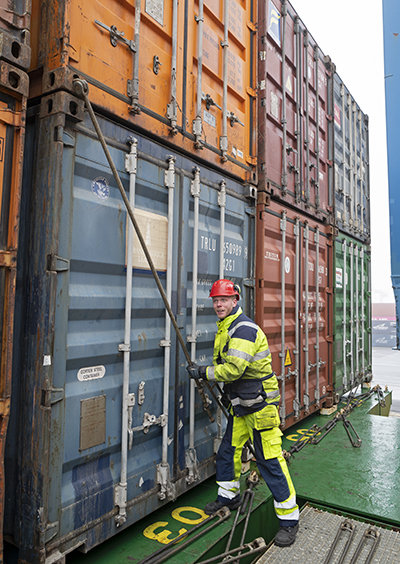 Vi lämnar båten. På väg nedför den lodräta lejdaren är det inte svårt att förstå varför såväl sjömän som hamnarbetare helst vill slippa den manuella surrningen av containrar som staplas på varandra som legoklotsar.