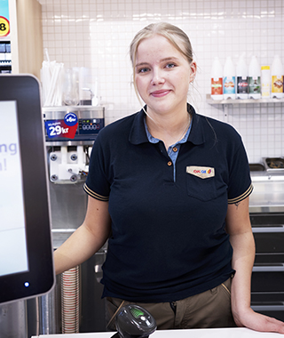 Inne på OK-macken står Ebba Axelsson i kassan för tillfället. Hon har arbetat på bensinstationen i ett år, sedan några månader som tillsvidareanställd. Ebba arbetar skift, men enbart dag, och tycker att det fungerar bra. Hon funderar på att gå med i facket men det har ännu inte blivit av.