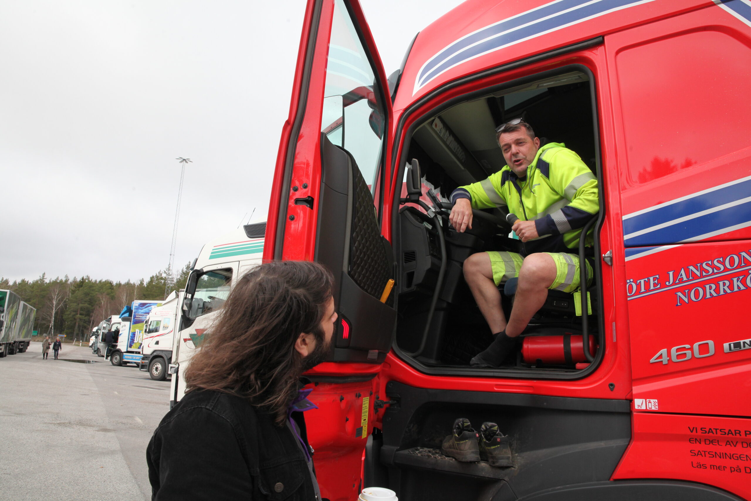 Utanför den stora OKQ8-macken är parkeringen full med långtradare. I en av dem sitter Mats Eriksson och ska äta lunch i hytten.