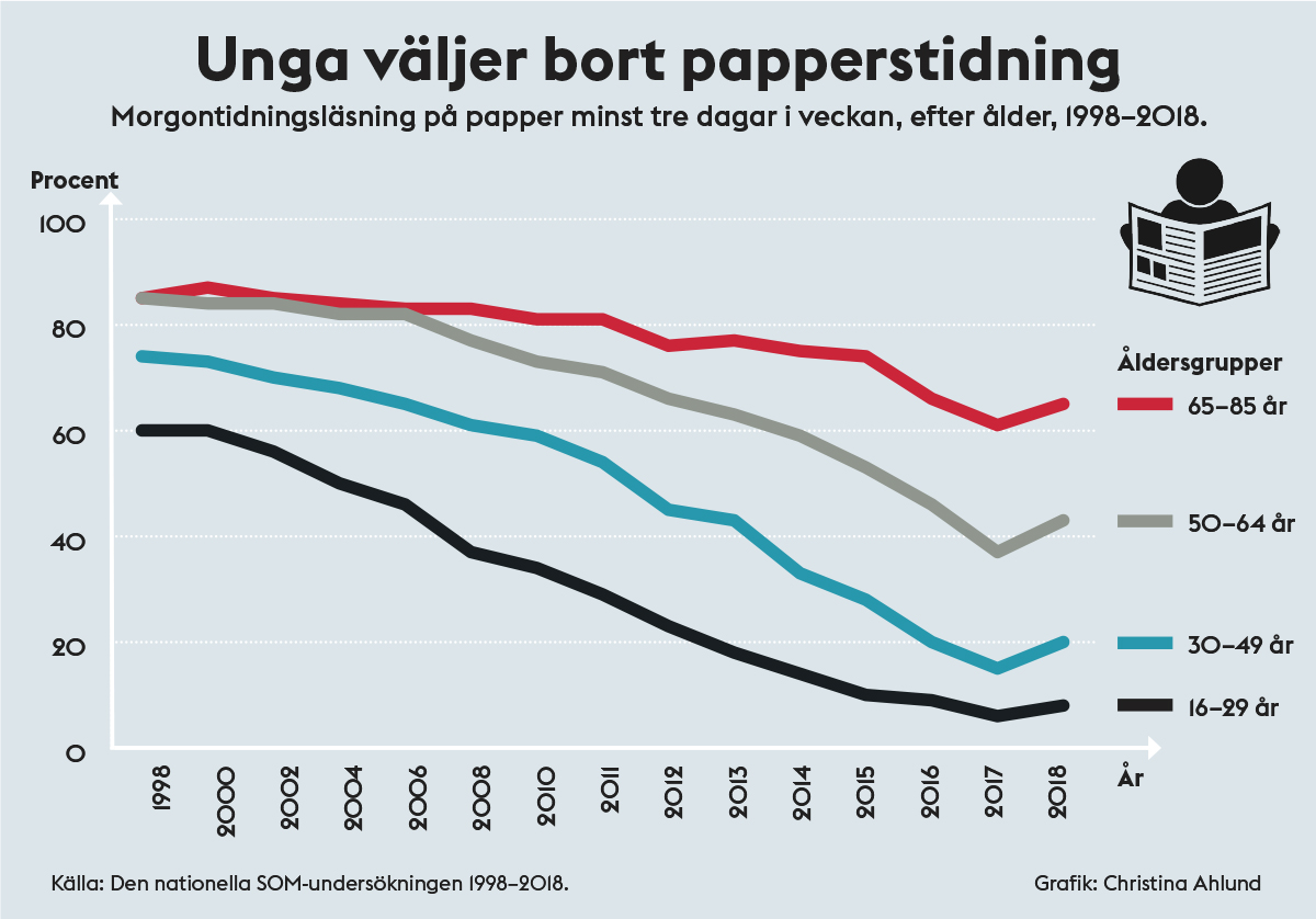 Experten från Tidningsutgivarna, Tobias Lindberg, ser trots allt en hygglig framtid för själv tidningarna. Han hänvisar till en studie från den globala konsultfirman Mather Economics, som visar att läsare är beredda att betala mer för sin tryckta tidning.