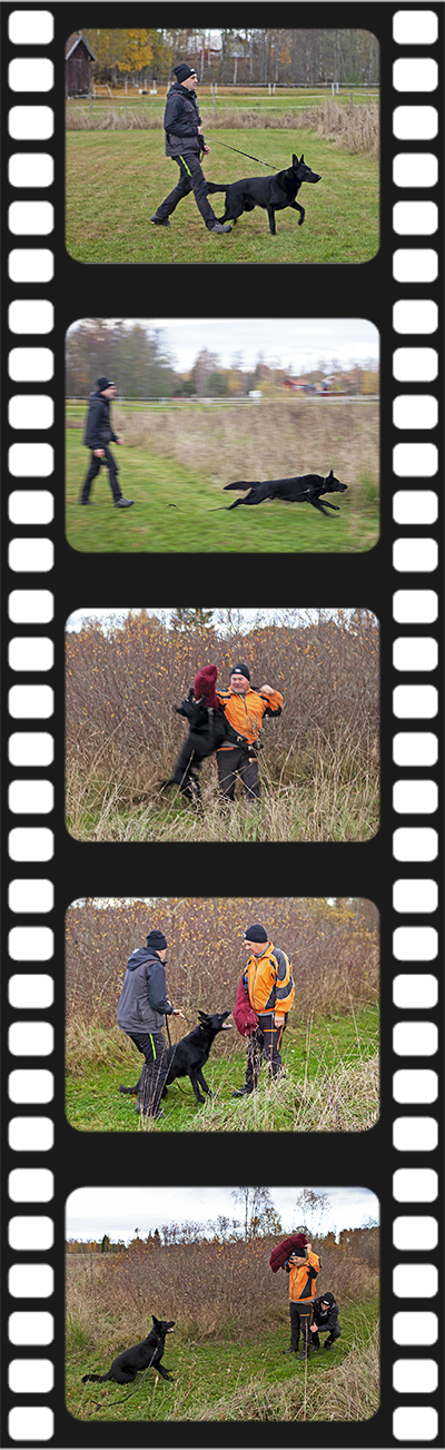 Där! Nixon ser ”boven” och Johansson släpper kopplet. Hunden tar språng och attackerar Törnqvists (vadderade) arm. Nära 40 kilo väktarhund har ett bra grepp. Kenneth Johansson ger kommando och snart har Nixon släppt och lagt sig ner på marken. Johansson säger visitera och hunden ligger kvar. Nixon håller position men kan inte vara helt stilla. Det spritter i kroppen.