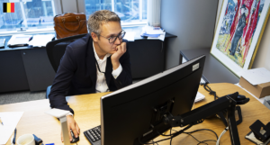 Ett par månader senare sitter han 40 mil därifrån på sitt tjänsterum i Bryssel. Rummet är placerat i en mörk och tråkig korridor utan den fina konst som smyckar de officiella delarna av parlamentsbyggnaden.