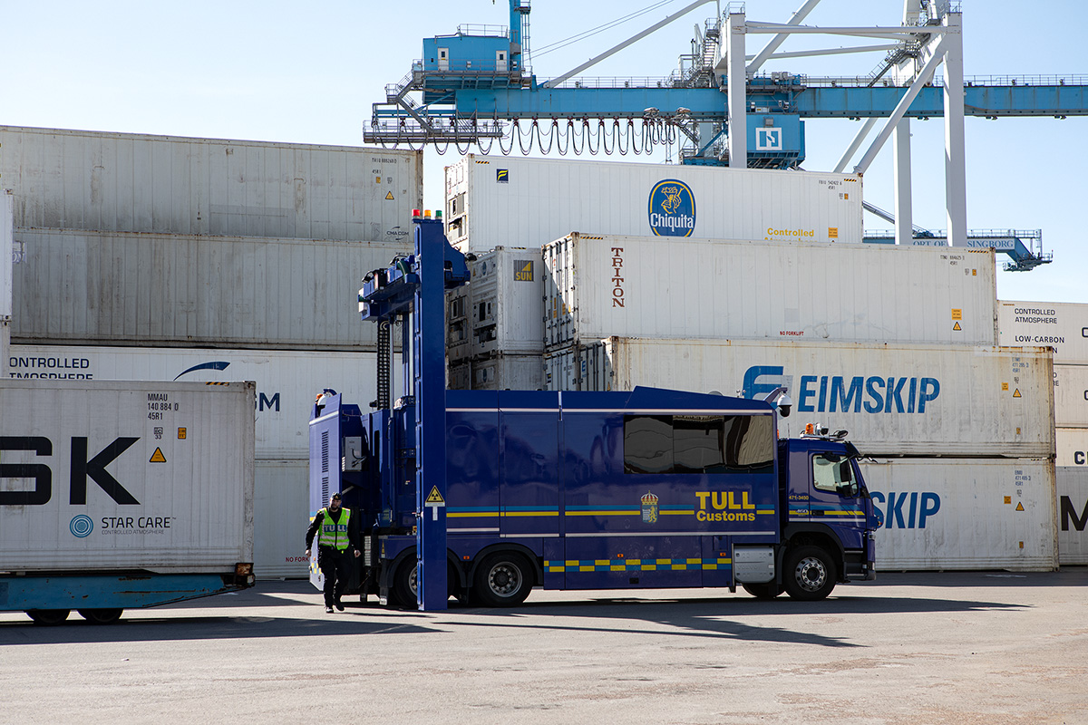 På plats är också den mobila scannern, ett slags jättelik röntgenapparat. Den tillhör den senaste generationen av sitt slag och har gått på 22 miljoner kronor, berättar Martin som sett fakturan. Totalt finns det i dag tre sådana här scannrar i landet, och med EU-pengar kommer det snart att bli två till. Bland annat ska Gävle hamn få en egen mobil scanner. För hamnarna i Skåne är det dock än så länge nödvändigt att dela.