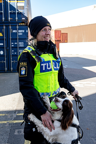 Vid containrarna värmer Jonna Nilsson upp med hunden Sadie, en engelsk springer spaniel, som får lukta efter tygbitar preparerade med narkotika. Sadie är skolad hos tullen här och har nu varit i tjänst i snart sex år.